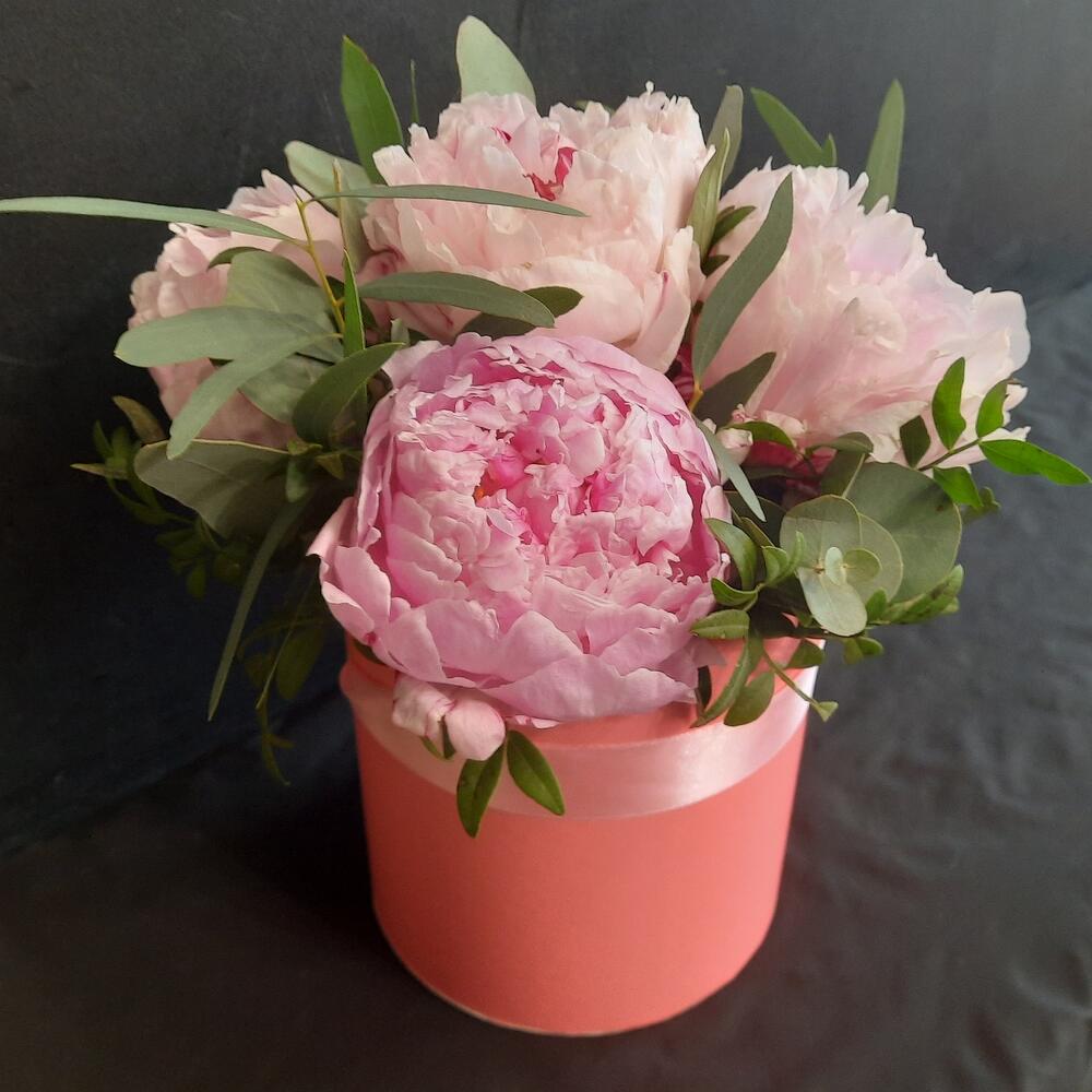 Эвкалипт – 1 шт.Коробка шляпная – 1 шт.Фисташка – 1 шт.Пион Сара Бернар – 5 шт.Оазис флористический – 1 шт.