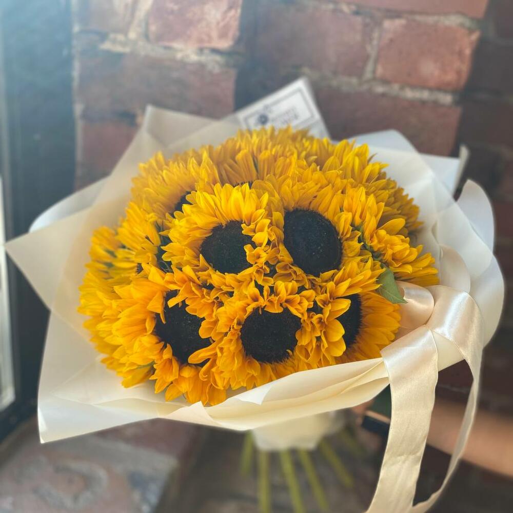 Букет из 19 подсолнухов в стильной упаковке “Солнечное сияние”