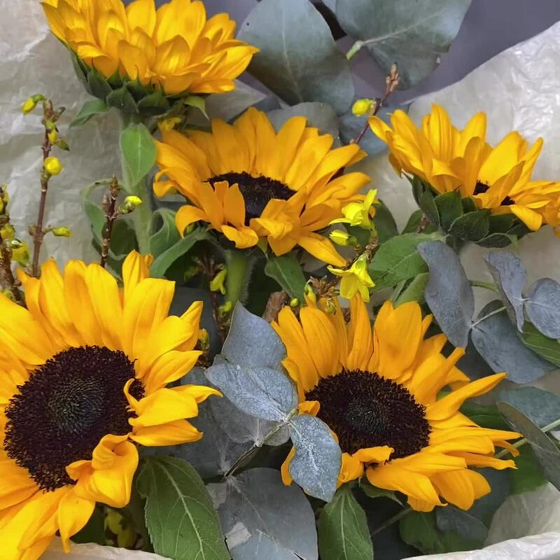 Лента атласная – 1 шт.Тишью – 2 шт.Подсолнух – 5 шт.Упаковка дизайнерская – 2 шт.Эвкалипт пучок – 1 шт.форзиция ветки – 2 шт.