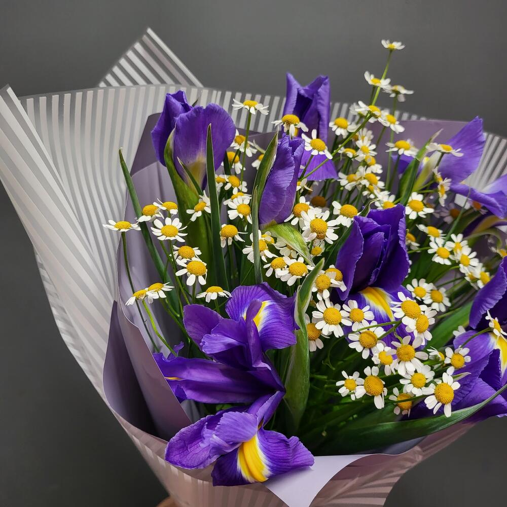 Ромашка кустовая – 4 шт.Упаковка дизайнерская – 1 шт.Ирисы фиолетовые – 9 шт.