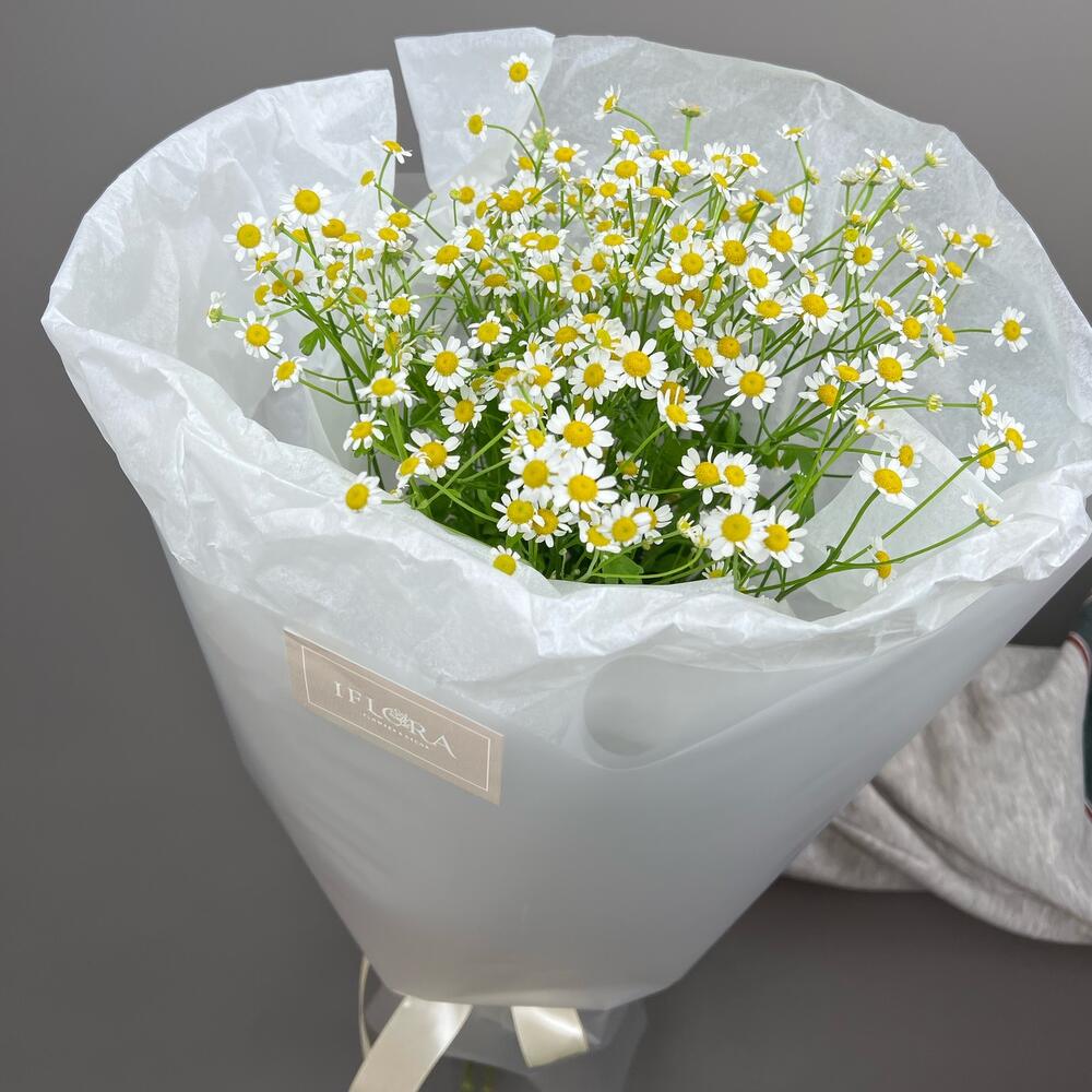 Кустовые ромашки в дизайнерской упаковке, выглядит очень эстетично и стильно.Букет перевязан атласными лентами.Можем подобрать шарики в цвет букета (напишите нам об этом).