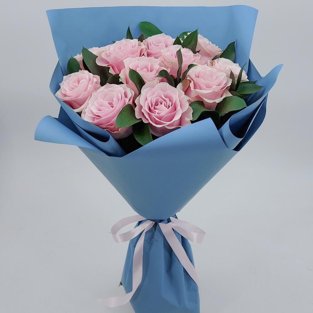 11 нежно-розовых роз с зеленью
