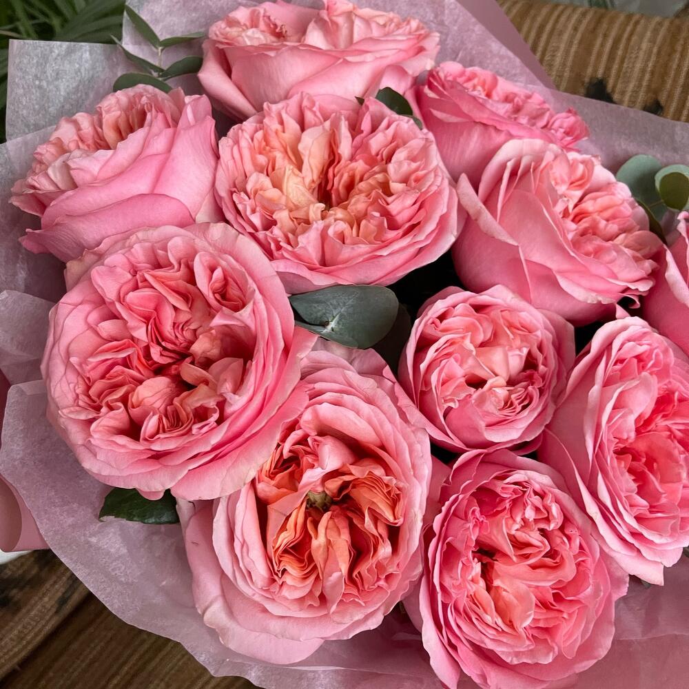 Эвкалипт – 3 шт.Роза пионовидная – 11 шт.Упаковка дизайнерская – 3 шт.