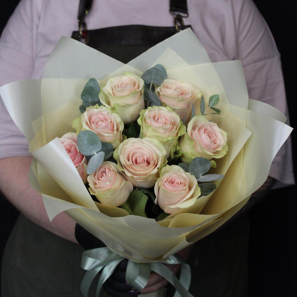 роза фруттето эквадор – 9 шт.Эвкалипт – 3 шт.Пленка матовая – 4 шт.Лента атласная – 2 шт.