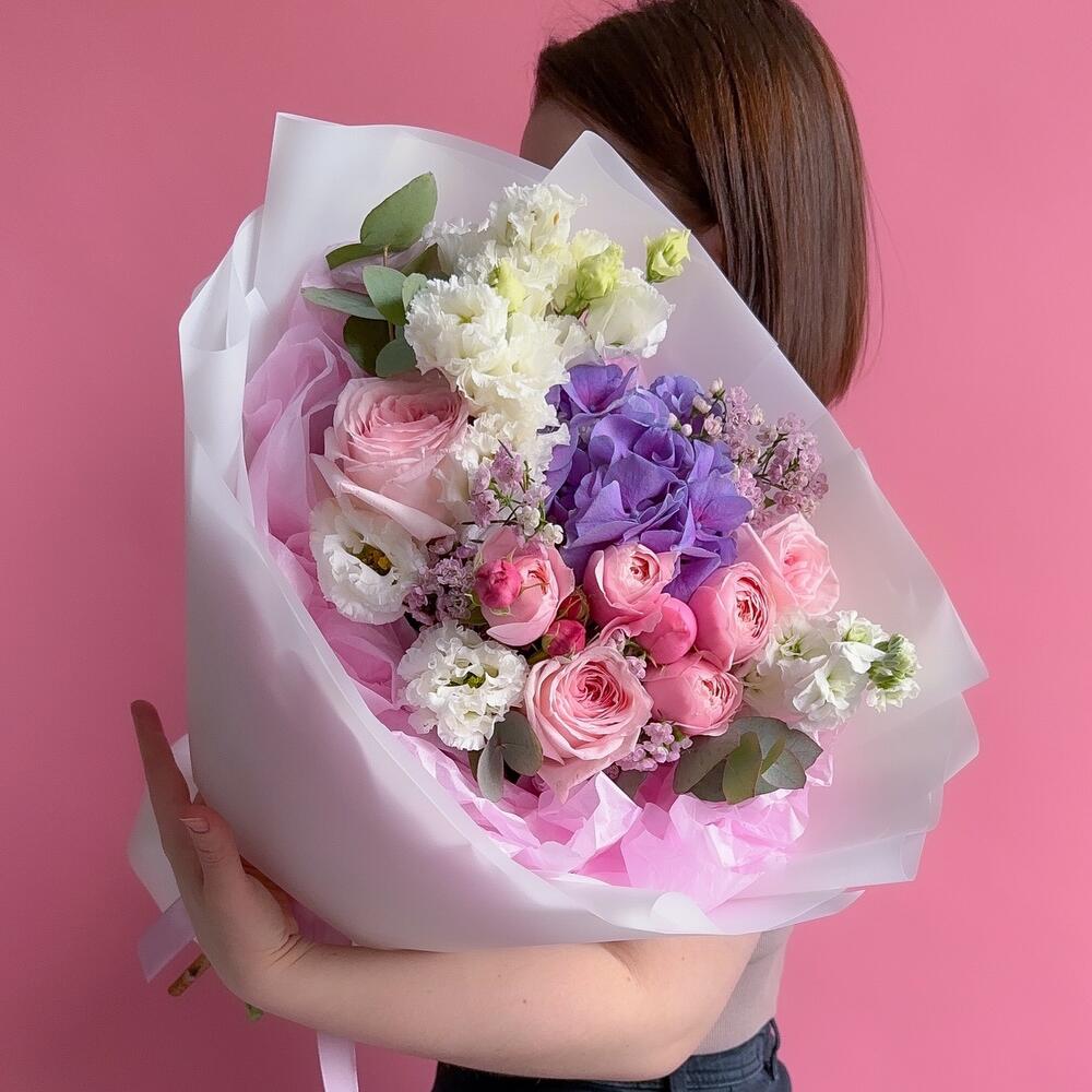 Гортензия – 1 шт.Эвкалипт – 2 шт.Кустовая роза – 1 шт.Хамелациум – 1 шт.Маттиола белая – 1 шт.эустома белая – 2 шт.Дизайнерская упаковка – 1 шт.pink o’hara роза – 3 шт.