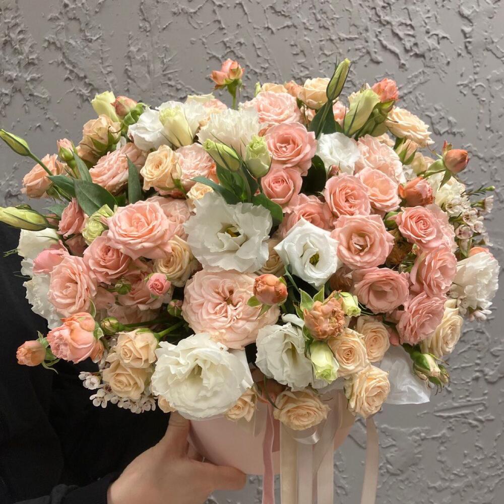 Кустовая роза – 13 шт.Эустома белая махровая – 3 шт.Ваксфлауэр – 1 шт.зелень декоративная – 3 шт.Шляпная коробка – 1 шт.Пиафлор (оазис) – 1 шт.ленты – 2 шт.Тишью – 1 шт.
