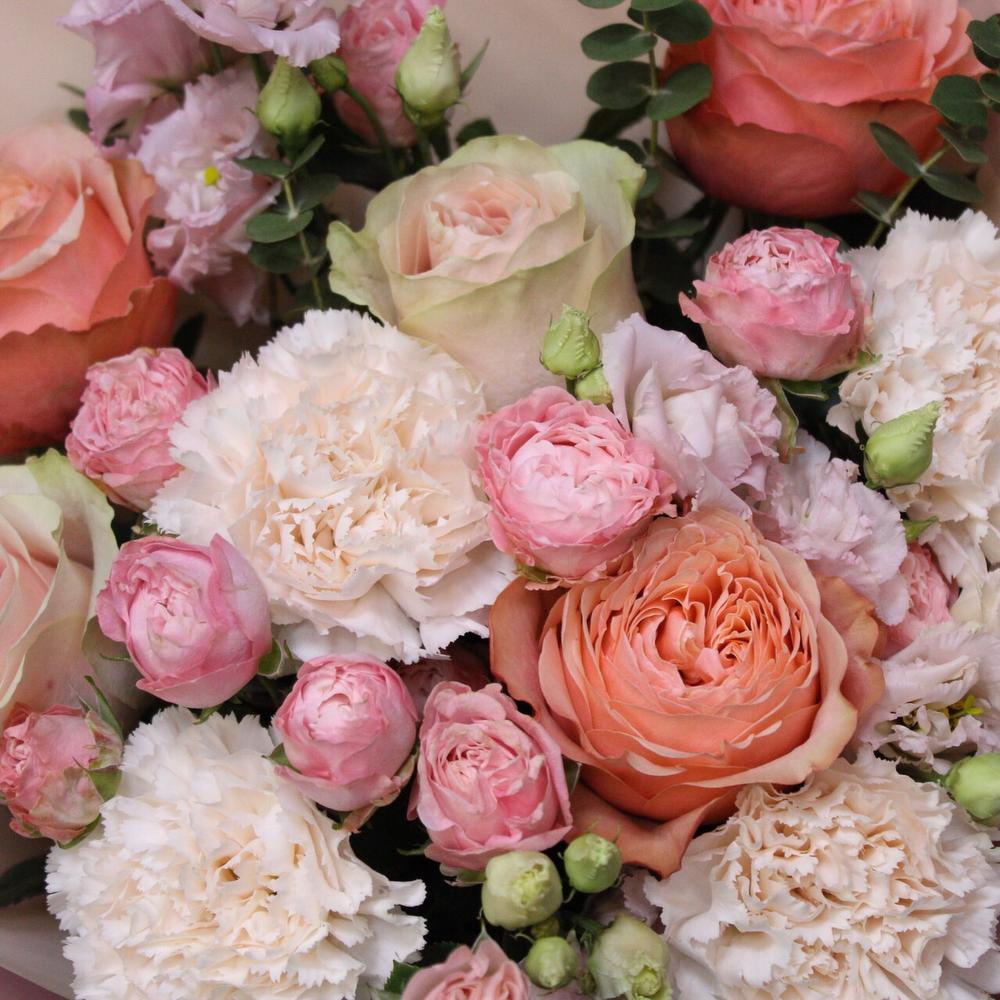 Роза пионовидная кахала – 3 шт.роза эквадор фруттето – 2 шт.Диантус – 4 шт.роза пионовидная кустовая мадам бомбастик – 3 шт.эустома махровая розовая – 2 шт.Эвкалипт – 2 шт.Пленка матовая – 3 шт.Лента атласная – 2 шт.