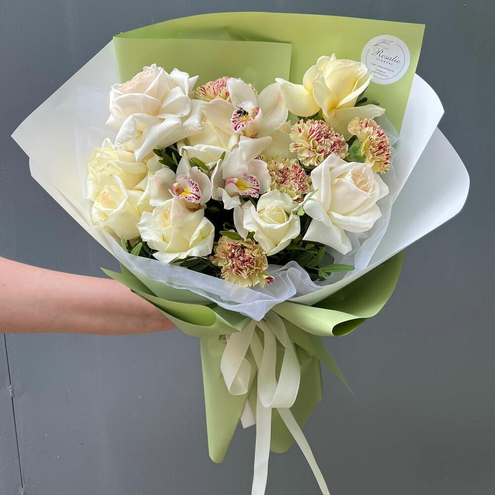 Альстромерии, Гвоздики, Кустовые розы, Лизиантусы, Розы, Хризантемы