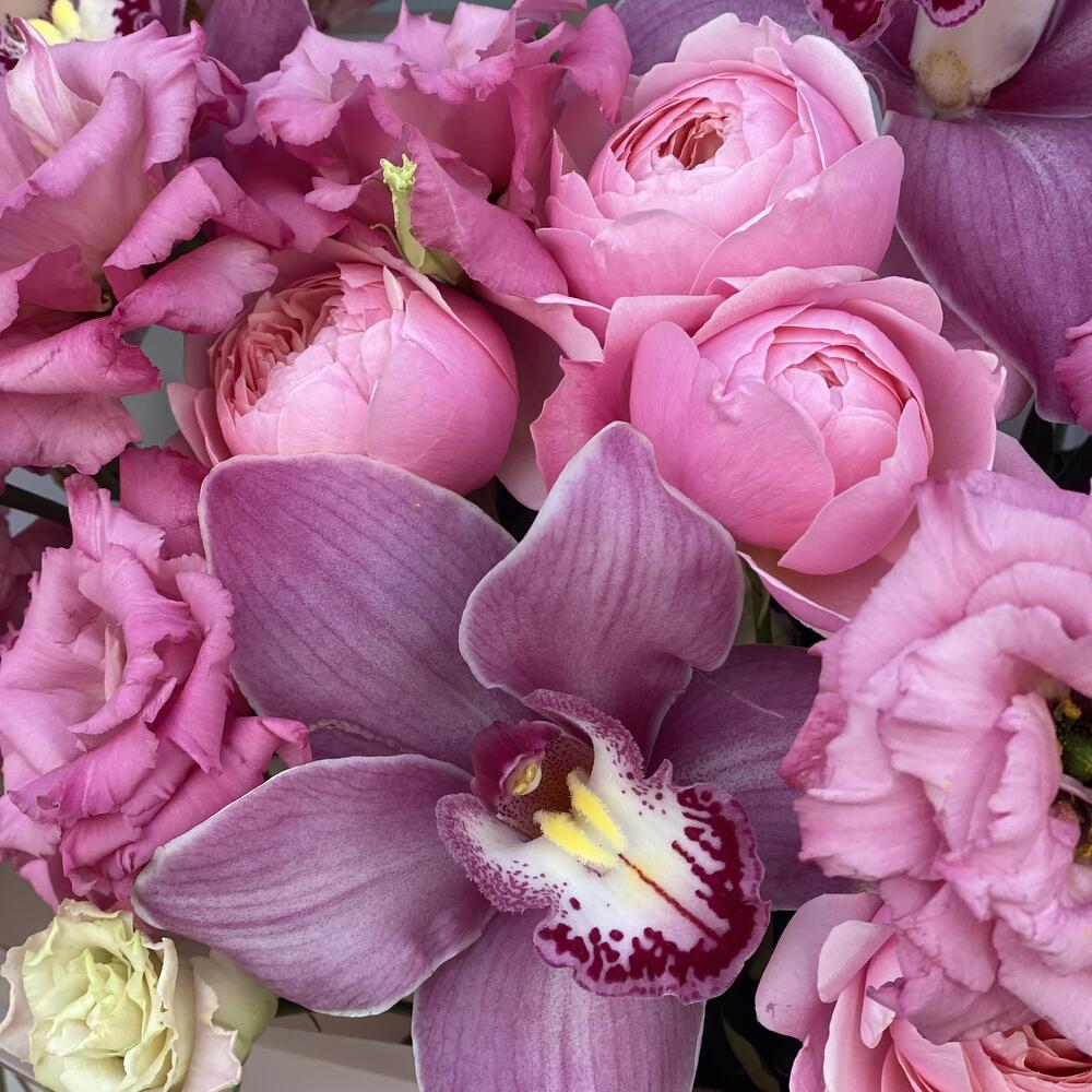 эустома алиса роуз – 4 шт. ЦИМБИДИУМ – 3 шт. Писташ – 2 шт. Кустовая пионовидная роза – 1 шт. Оформление – 1 шт.