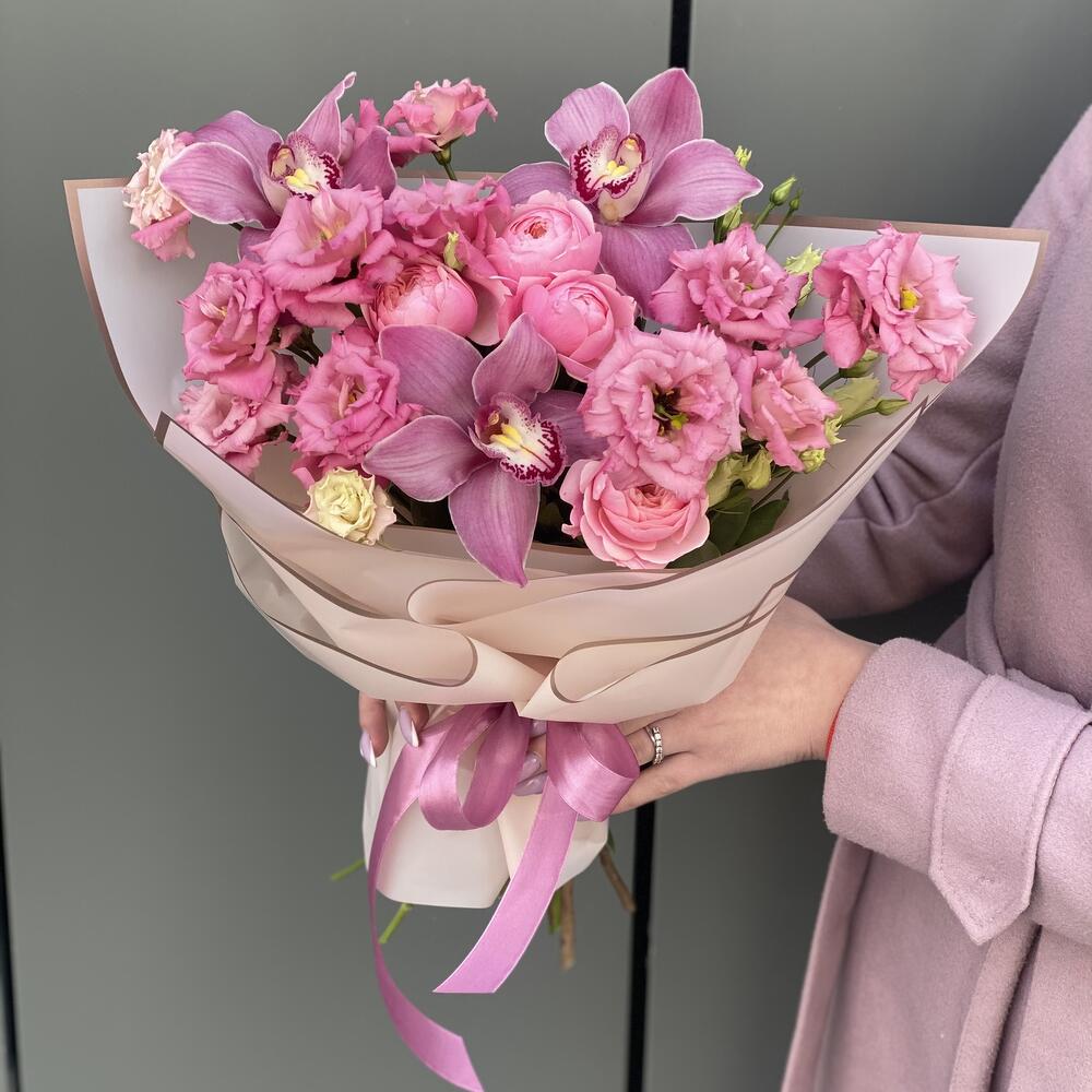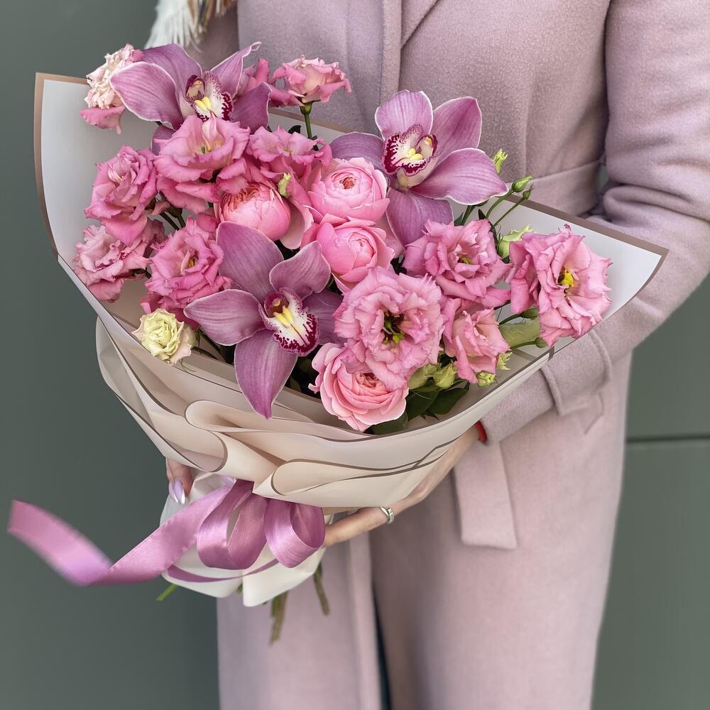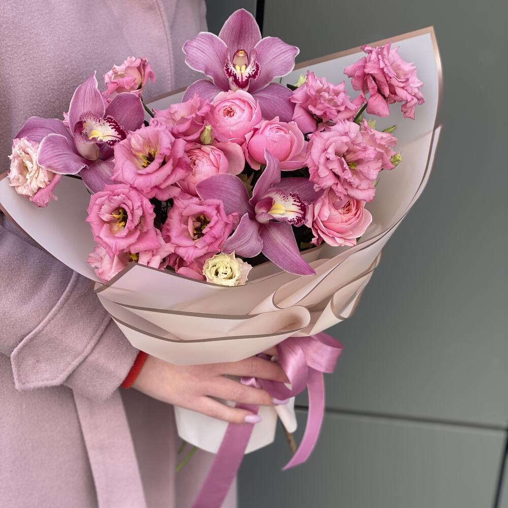 Сборный букет из кружевной эустомы сорта Алиса Роуз, цветков орхидеи и кустовой пионовидной розы в оформлении!