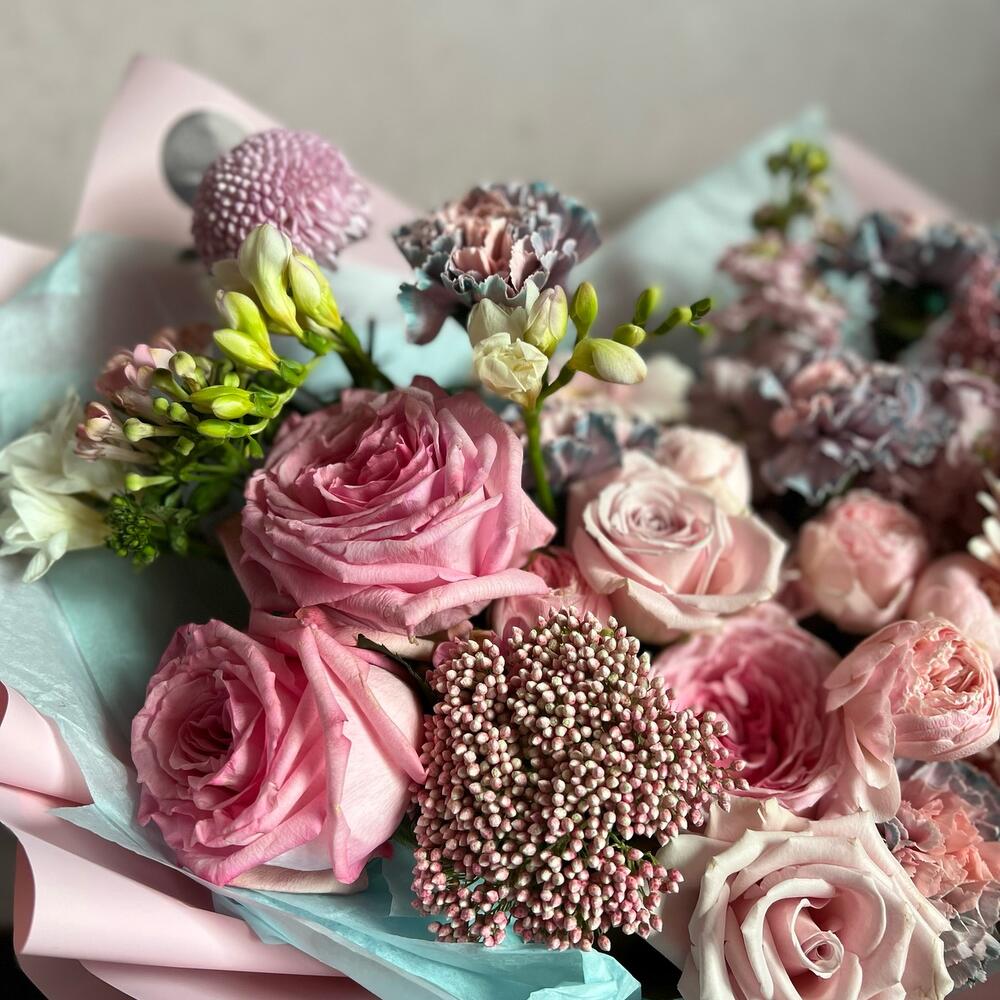 Кустовая пионовидная роза – 2 шт.Пионовидная одноголовая роза – 3 шт.Гвоздика – 6 шт.Фрезия – 3 шт.Гербера – 5 шт.Хризантема – 1 шт.Маттиола – 2 шт.Бувардия – 2 шт.Озотамнус – 1 шт.Солидаго – 1 шт.Роза одноголовая – 6 шт.декоративная упаковка – 1 шт.Атласная лента – 1 шт.