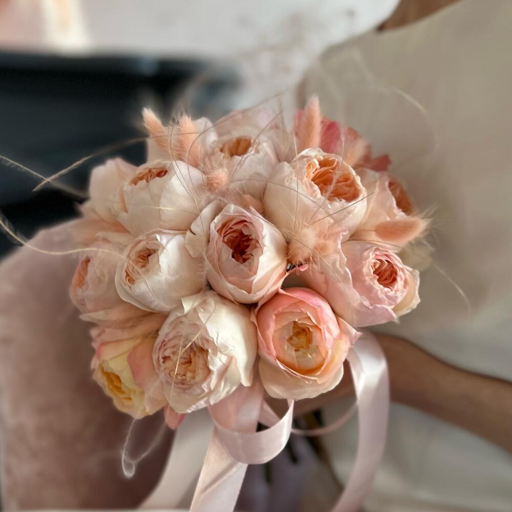 Пионовидная роза – 15 шт.Атласная лента – 1 шт.Лагурус (сухоцвет) – 12 шт.пучок сухоцветов – 5 шт.