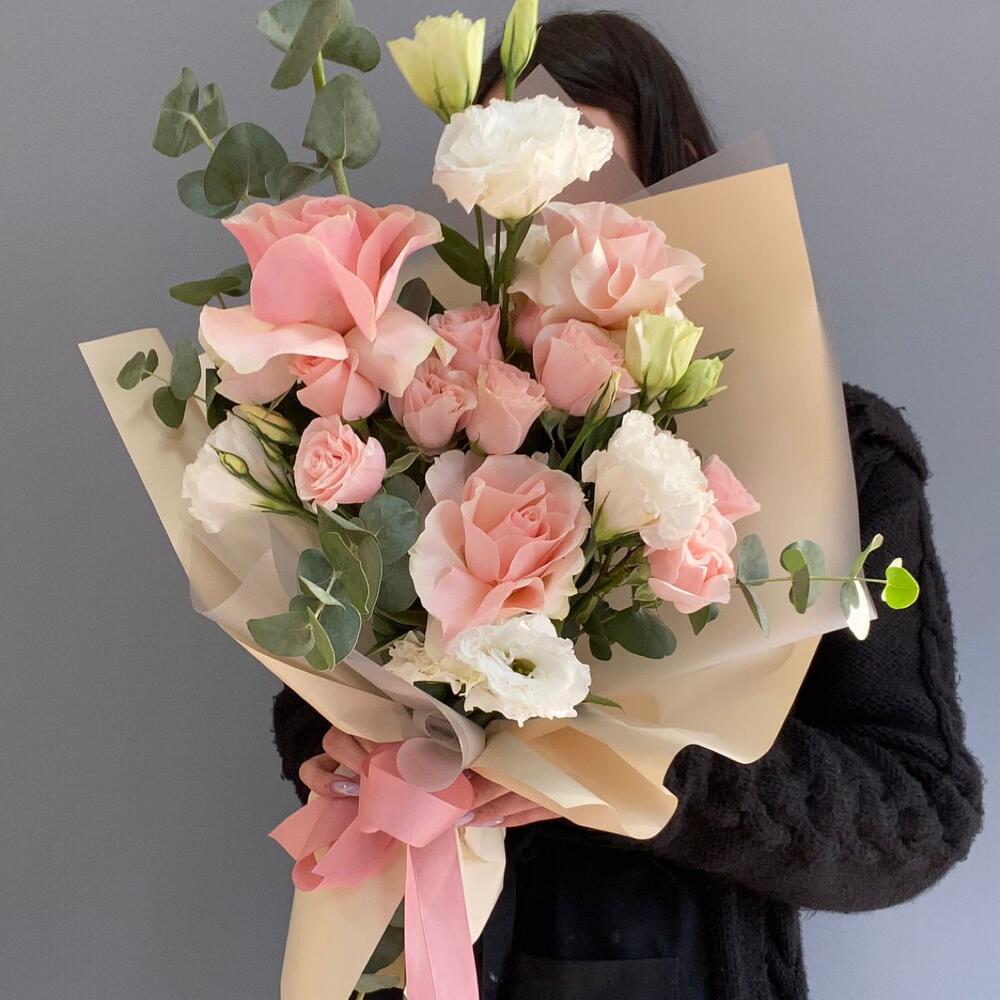 Альстромерии, Гвоздики, Кустовые розы, Лизиантусы, Розы, Хризантемы
