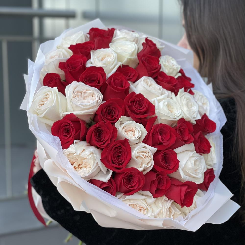 Букет из ароматных пионовидных и красных роз в оформлении!