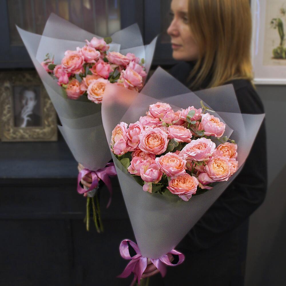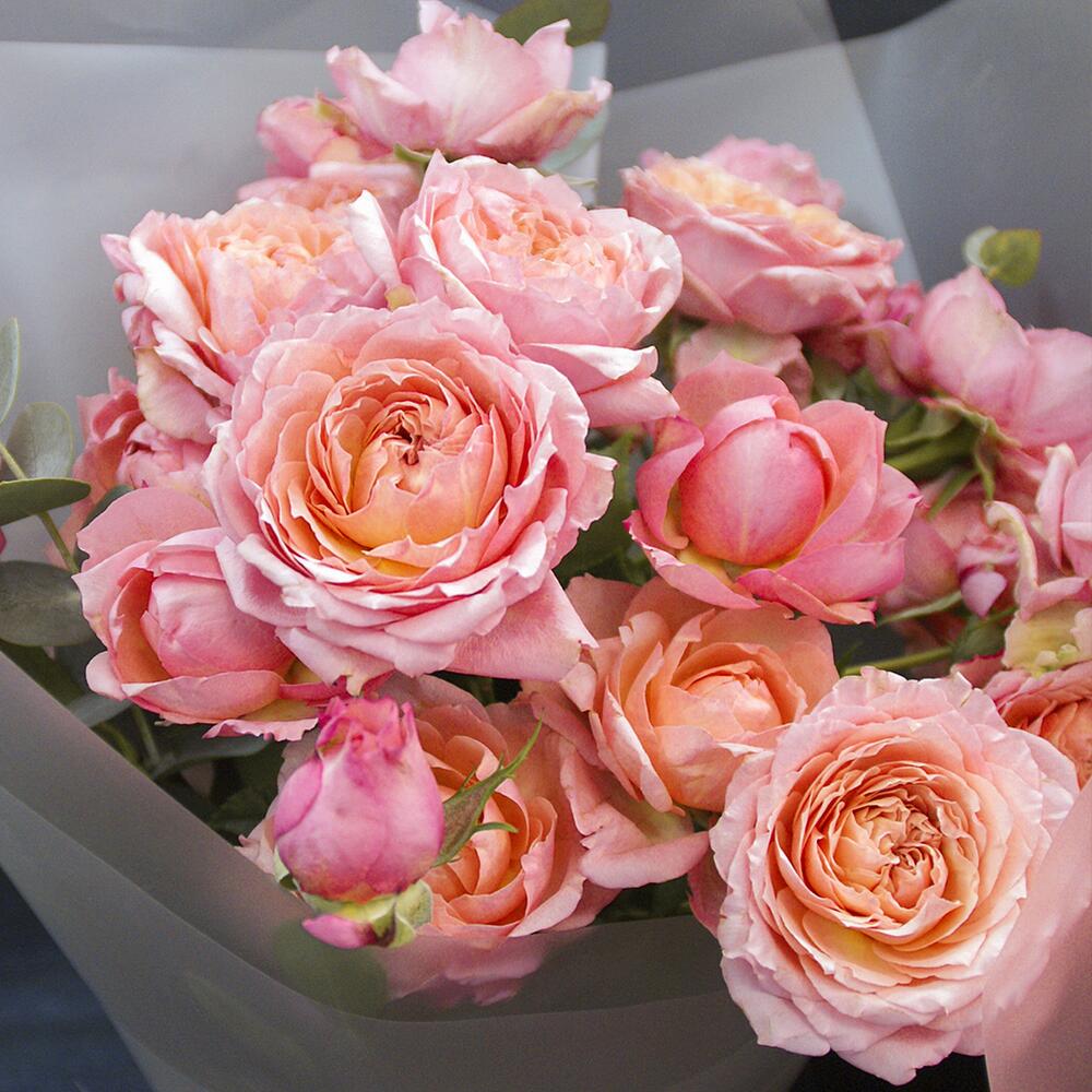Эвкалипт – 1 шт.Атласная лента – 2 шт.Матовая пленка – 2 шт.Роза кустовая пионовидная джульетта – 5 шт.
