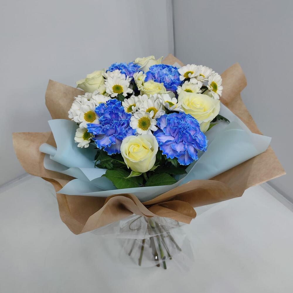 роза кения 40 см – 5 шт.диантусы голубые – 4 шт.Хризантема кустовая Сантини – 4 шт.Дизайнерская упаковка – 1 шт.