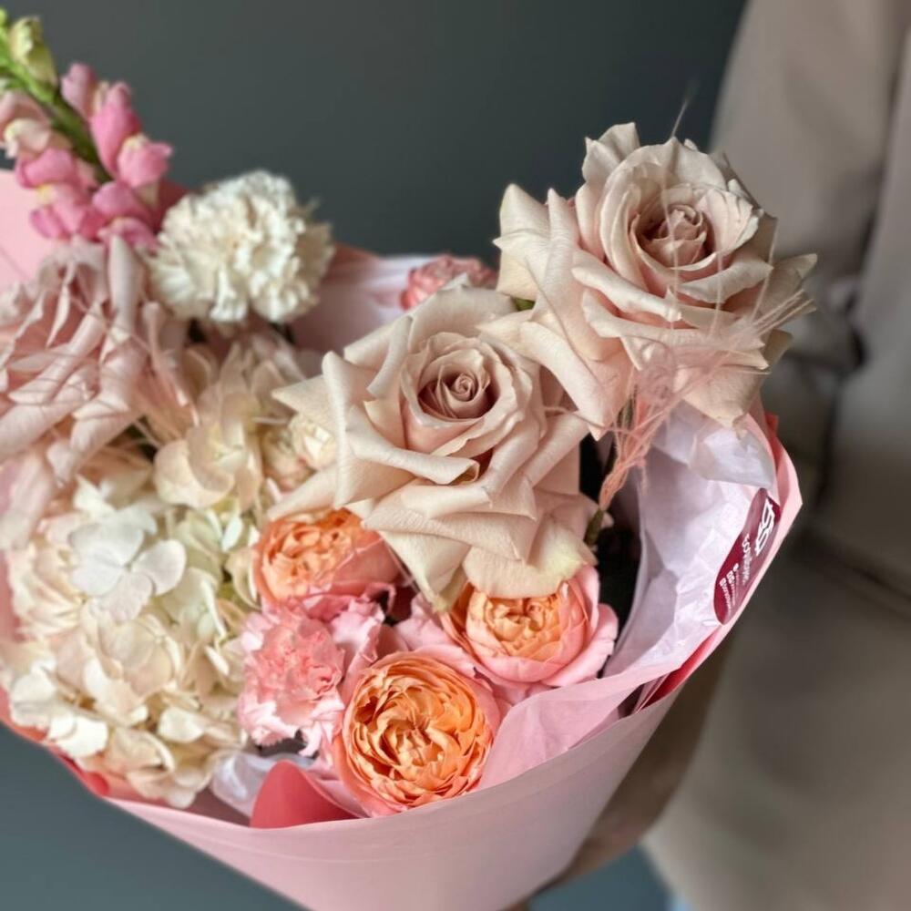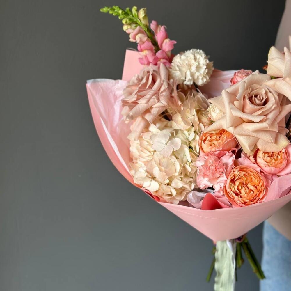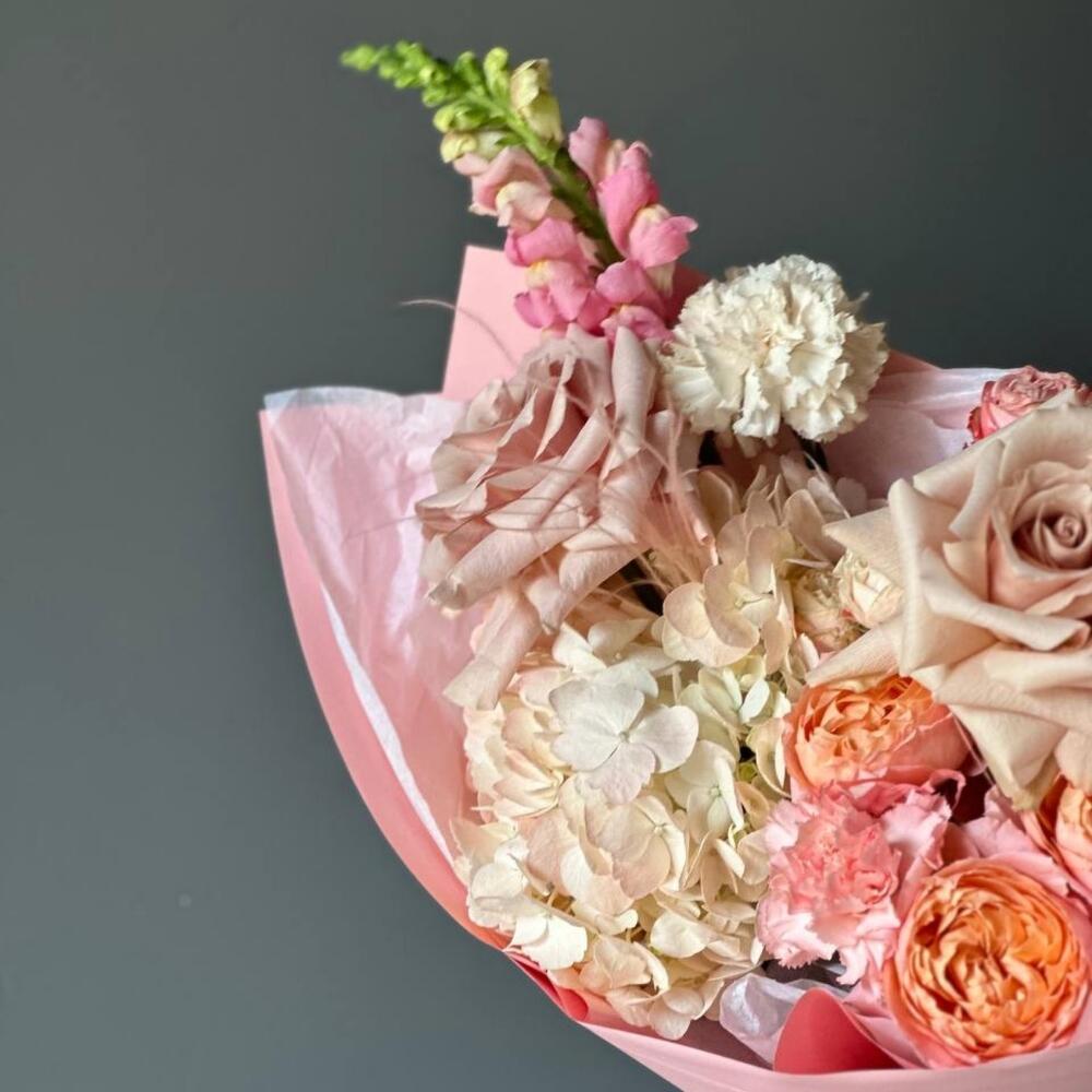 антиринум – 1 шт.Кустовая роза Бомбастик – 1 шт.Диантус – 2 шт.Сухоцветы – 2 шт.Упаковка дизайнерская – 1 шт.Гортензия розовая – 1 шт.роза квиксенд – 3 шт.джульетта кустовая роза пионовидная – 1 шт.