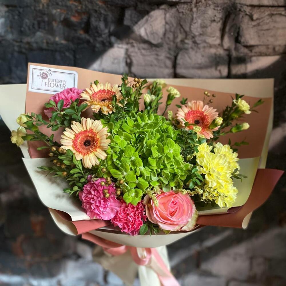 Букет из гортензии, гербер, диантуса, лимониума, кустовой хризантемы и зелени в стильной упаковке “Карамель со вкусом лета”
