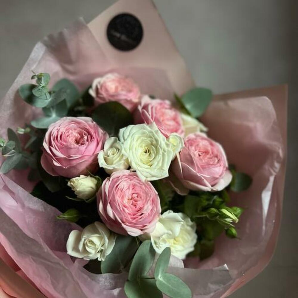 Пионовидная роза кустовая – 2 шт.кустовая роза жанин – 2 шт.Эвкалипт – 3 шт.декоративная упаковка – 2 шт.Атласная лента – 2 шт.