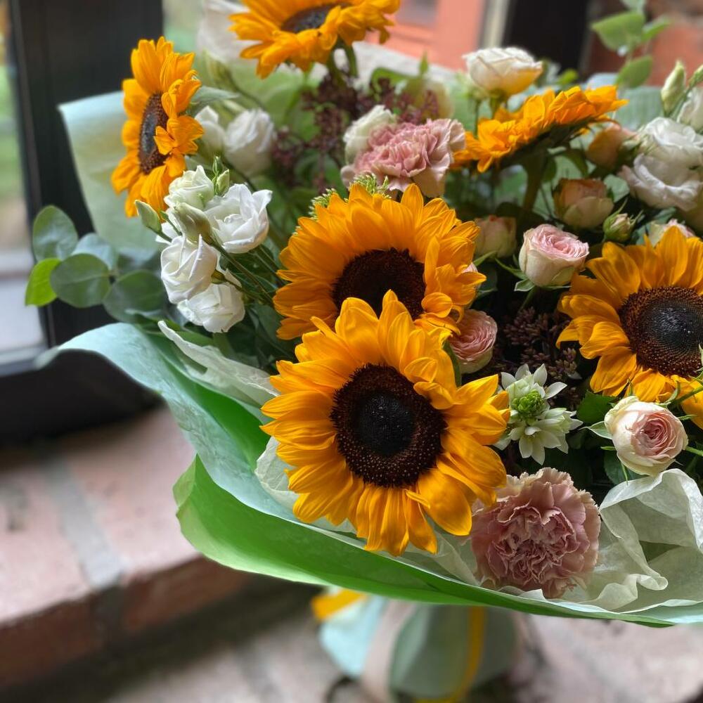 Эвкалипт – 3 шт.Упаковка – 2 шт.Эустома – 5 шт.Диантус – 2 шт.Орнитогалум – 2 шт.Подсолнух – 7 шт.Роза кустовая пионовидная – 4 шт.Седум – 4 шт.