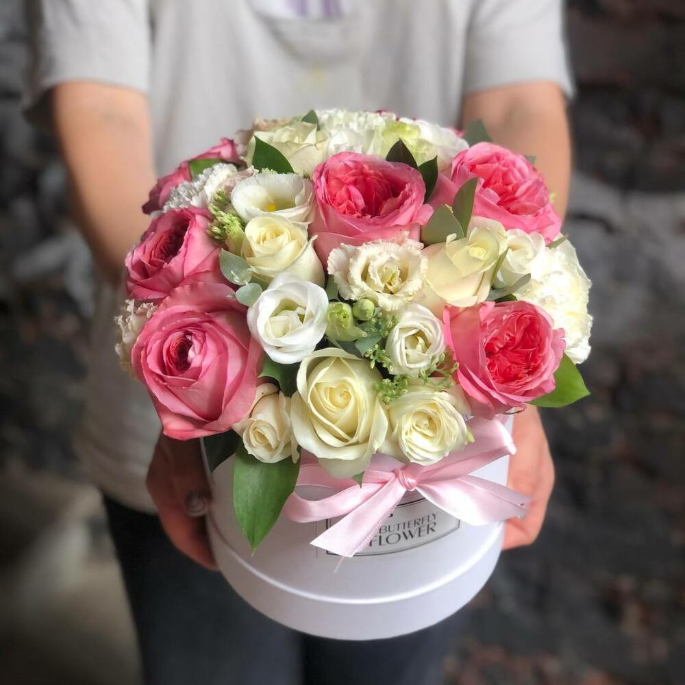 Шляпная коробка – 1 шт.Оазис – 1 шт.Роза пионовидная – 7 шт.Роза белая – 4 шт.Диантус – 4 шт.Эустома – 4 шт.Седум – 2 шт.Эвкалипт – 2 шт.Рускус – 2 шт.