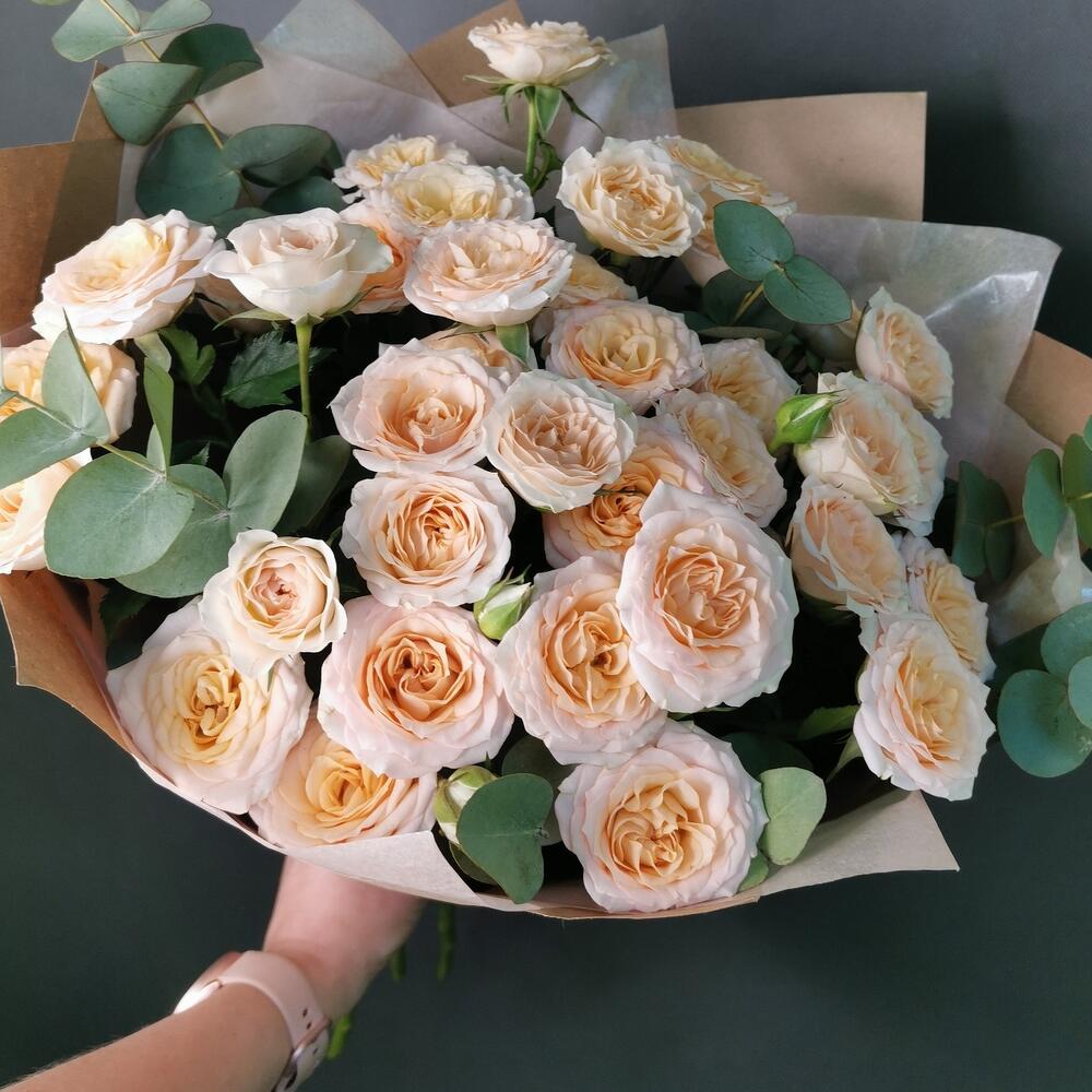 Роза кустовая – 5 шт.Эвкалипт – 2 шт.Упаковка крафт – 1 шт.