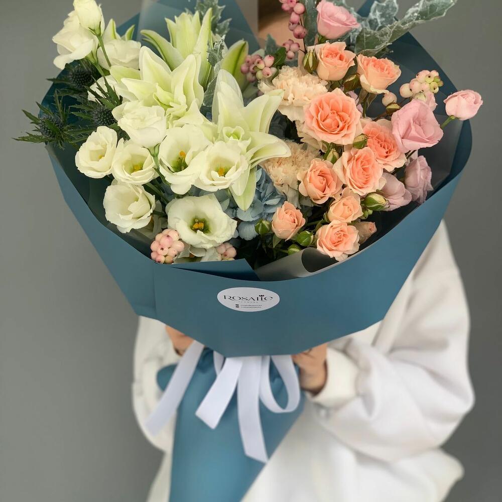 Альстромерии, Кустовые розы, Лизиантусы, Пионовидные розы, Розы, Ромашки