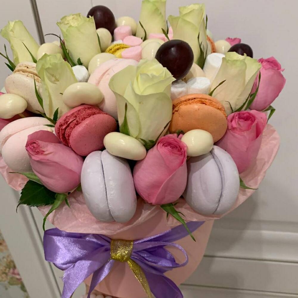 макарон (пирожное) – 6 шт.орехи в глазури – 100 гр.розы белые россия – 9 шт.розы розовые – 9 шт.зефир цветной – 200 гр.мешмеллоу – 100 гр.