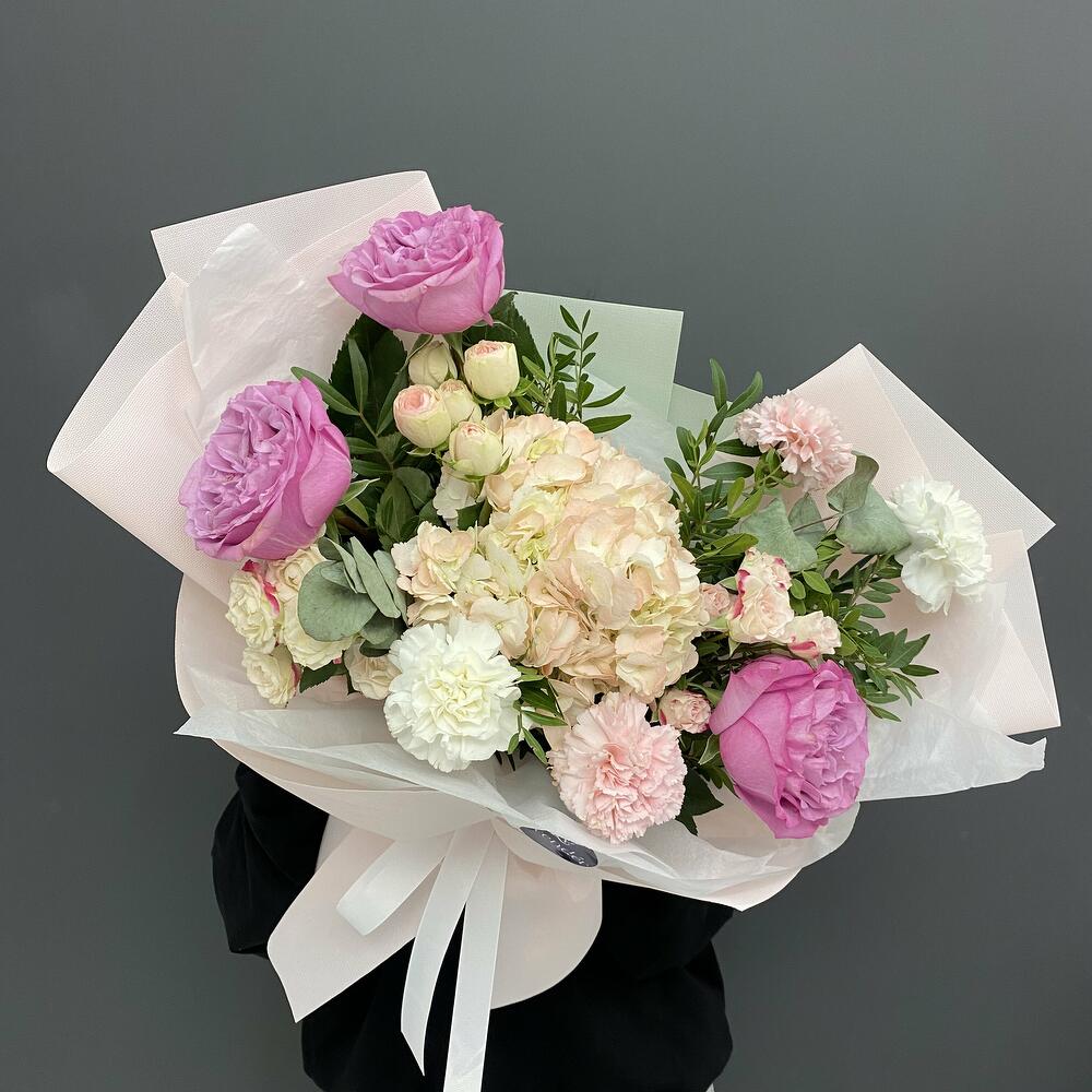 Гвоздики, Лизиантусы, Розы, Тюльпаны