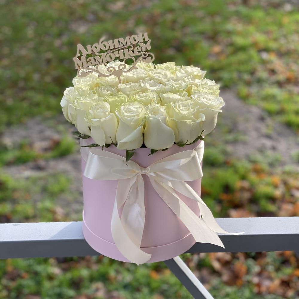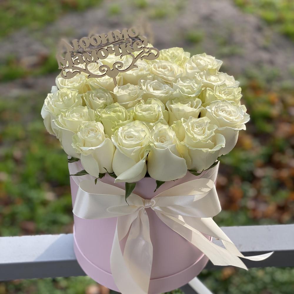 Роза Мондиаль – 25 шт.Коробка шляпная – 1 шт.Топпер маме – 1 шт.бант атласный – 1 шт.