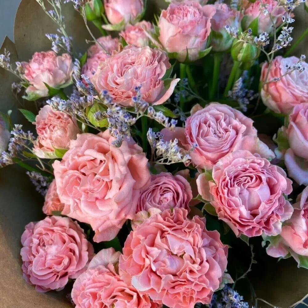 Букет пион роз с веточками Лимониума