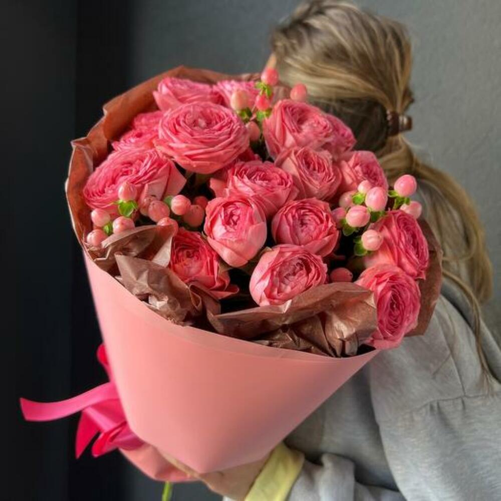 Роза кустовая пионовидная – 5 шт.Гиперикум – 3 шт.декоративная упаковка – 1 шт.Атласная лента – 1 шт.