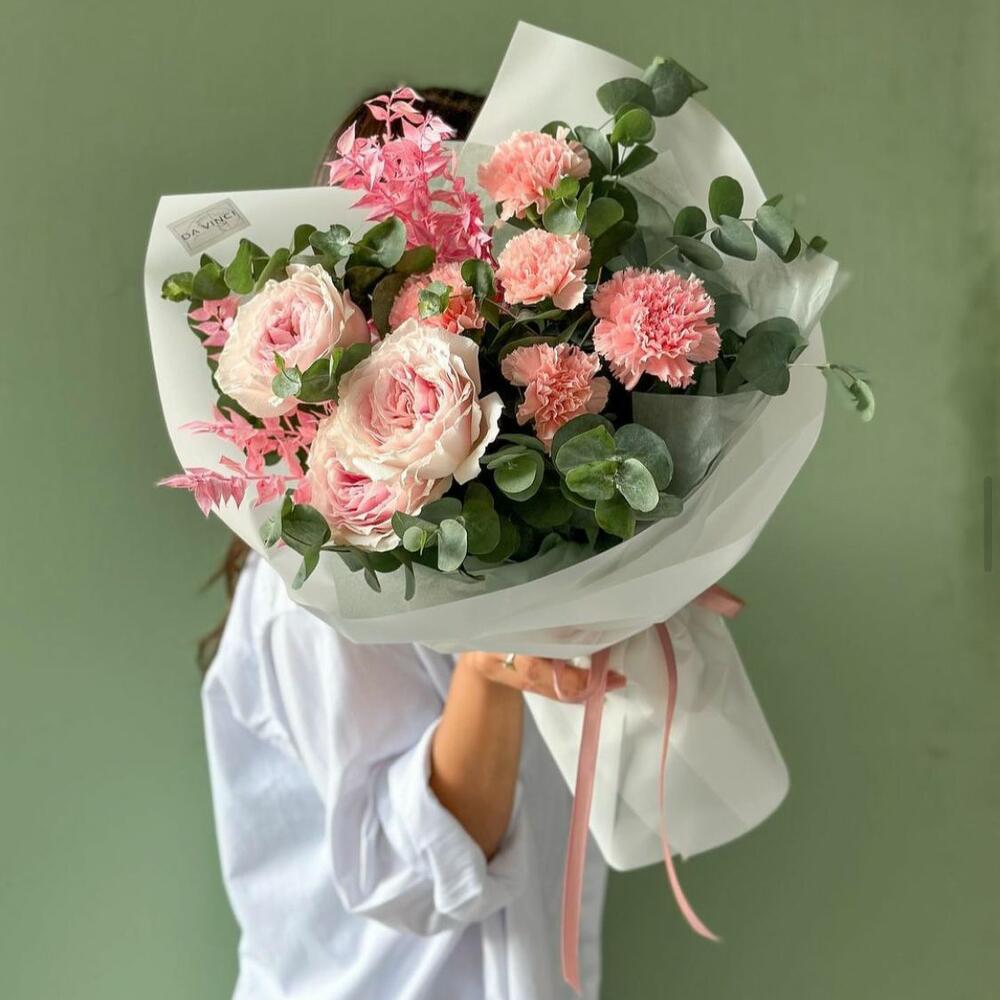 Композиция "Rossi" с гвоздикой, розами и эвкалиптом в стильном оформлении. – Выбрав букет от DaVinci Flowers