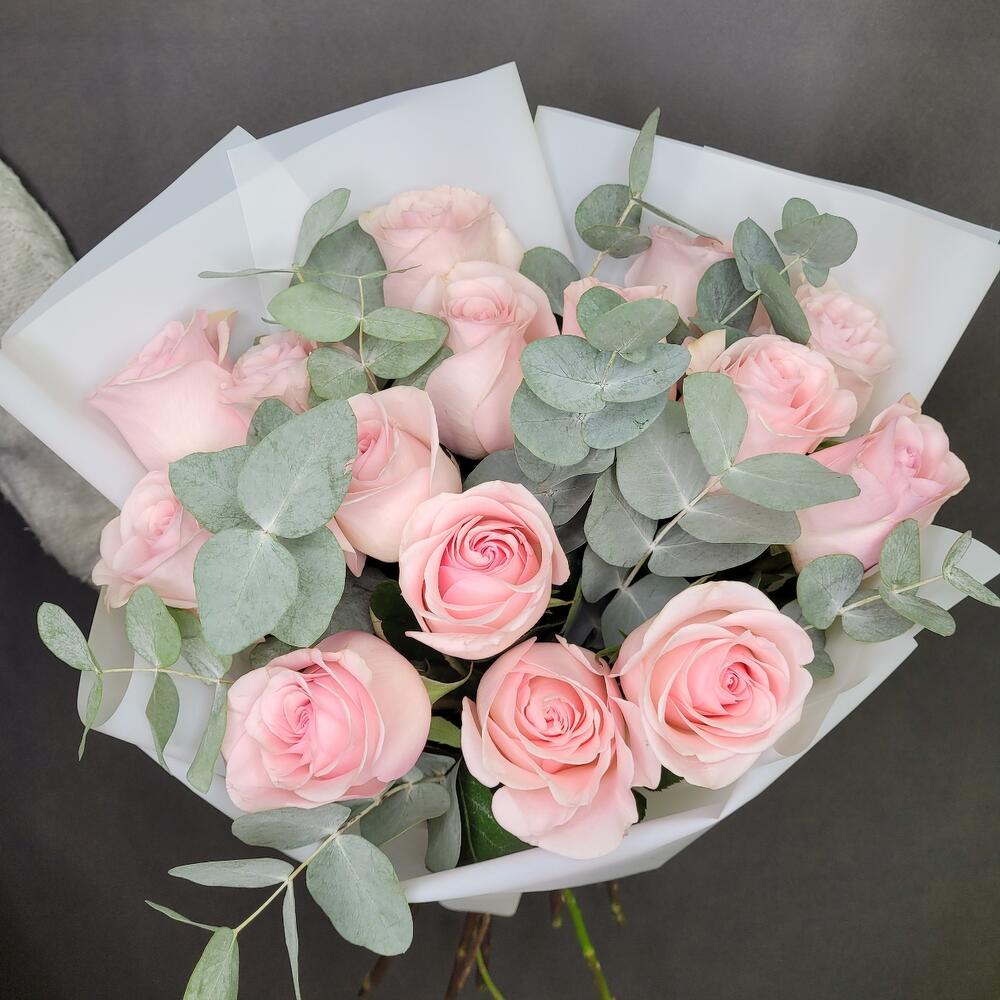 Роза Эквадор – 15 шт.Эвкалипт – 7 шт.Упаковка дизайнерская – 1 шт.Лента атласная – 1 шт.