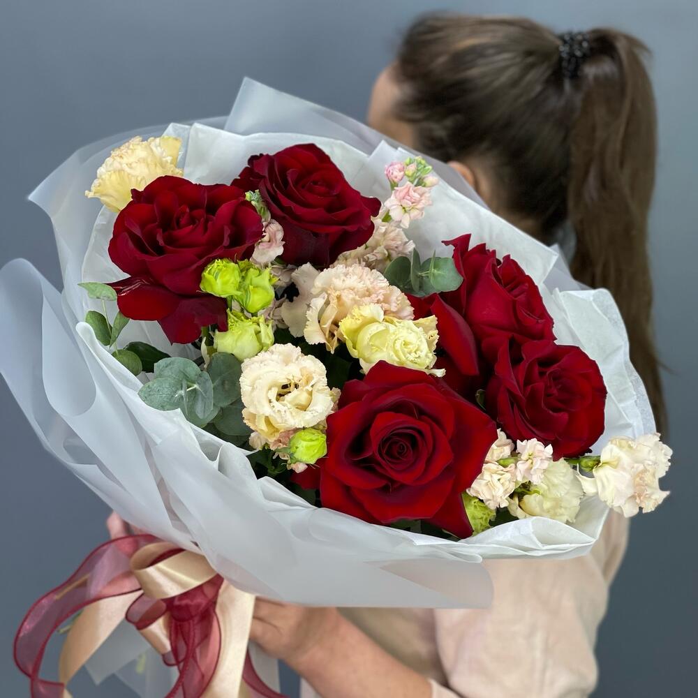Лента – 1 шт.Лизиантус – 2 шт.Маттиола – 3 шт.Эвкалипт – 1 шт.Упаковка – 1 шт.Тишью – 2 шт.Роза французская – 5 шт.