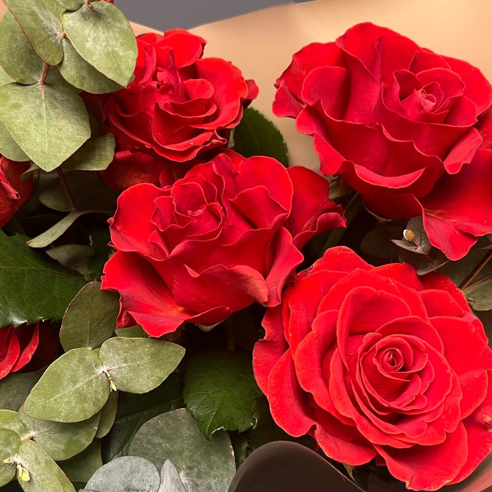 Эвкалипт – 3 шт.Роза одноголовая – 7 шт.Лента атласная – 1 шт.Упаковка дизайнерская – 2 шт.