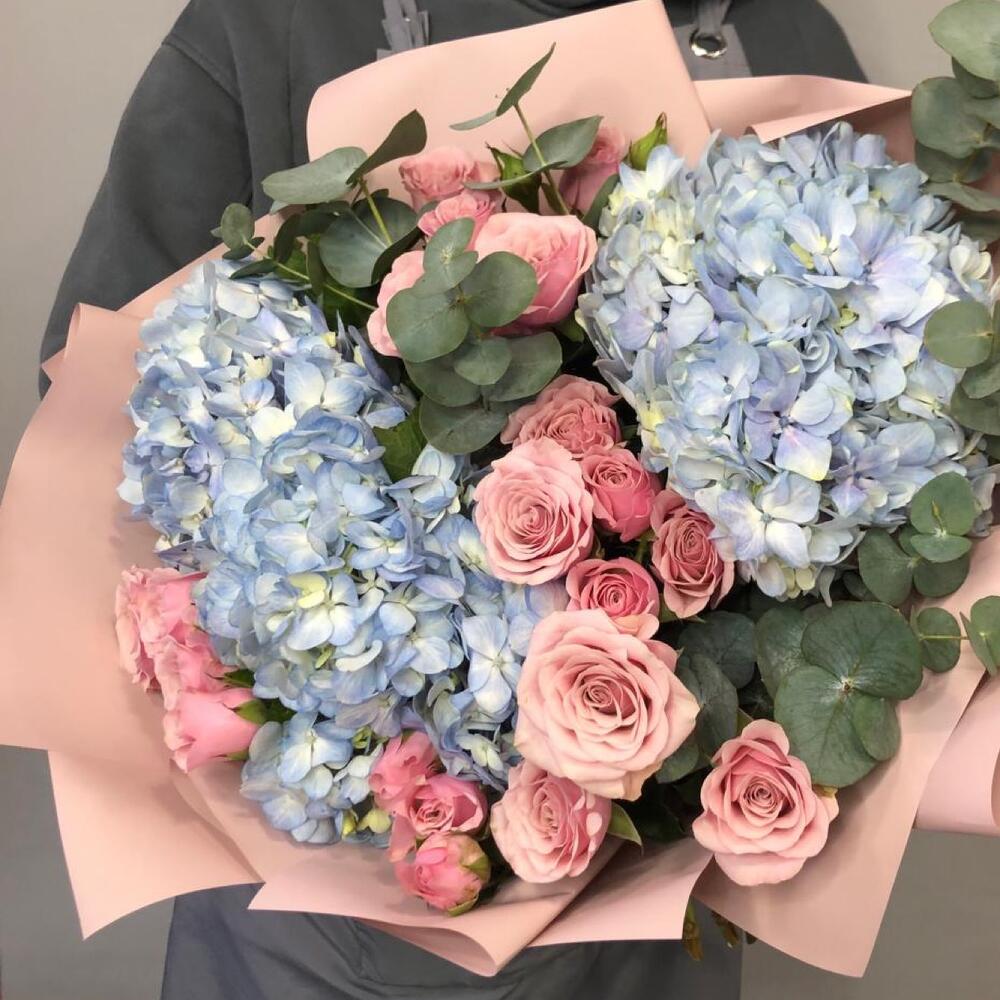Гортензия – 3 шт.Роза кустовая – 4 шт.Эвкалипт – 3 шт.Корейская упаковка – 1 шт.бант атласный – 1 шт.