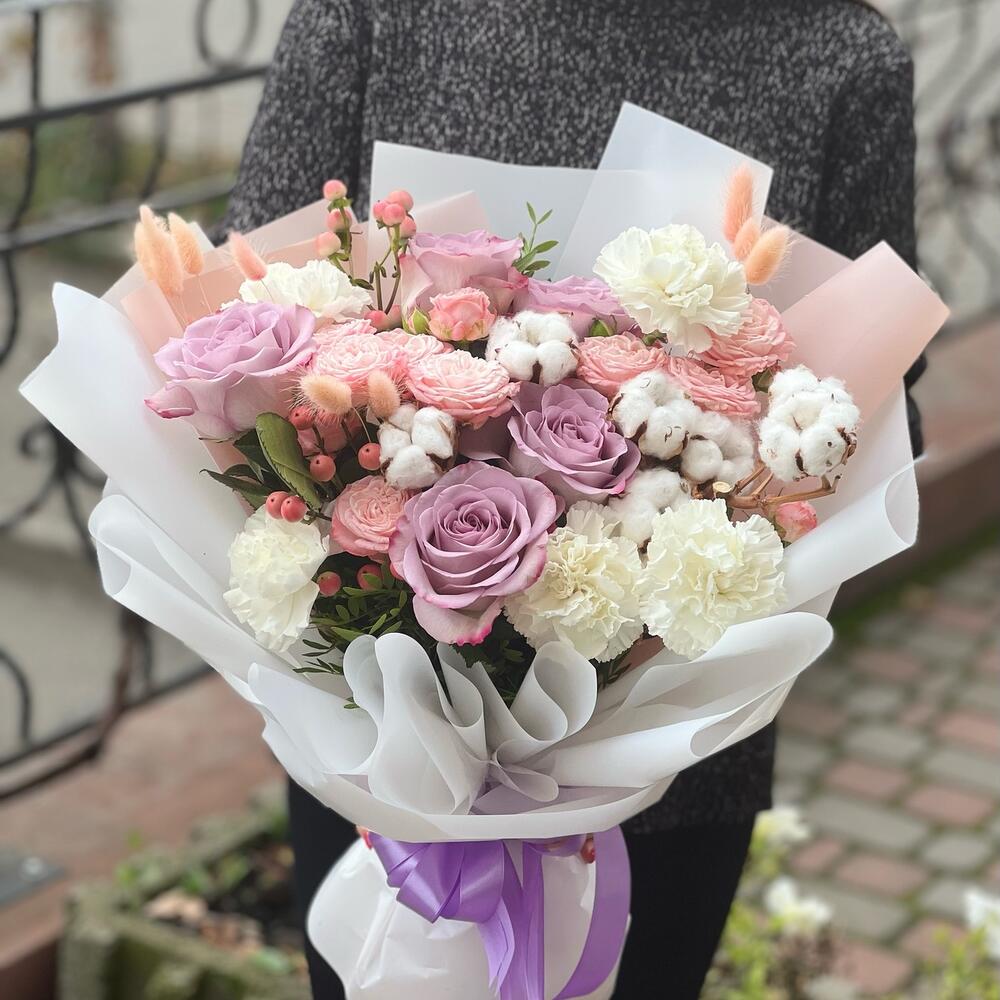 Гвоздики, Лизиантусы, Розы, Тюльпаны