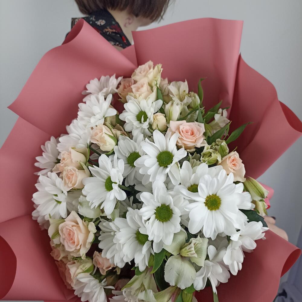 Альстромерия – 4 шт.Лента – 2 шт.Роза кустовая – 5 шт.Хризантема кустовая – 5 шт.Пленка матовая – 2 шт.