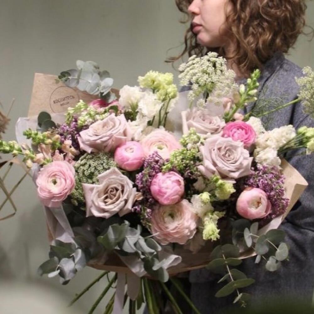 Пион – 3 шт.Сирень – 5 шт.Ранункулюс – 5 шт.Роза сортовая – 5 шт.Лизиантус – 5 шт.Львиный зев – 3 шт.зонтик садовый – 4 шт.Эвкалипт – 7 шт.Упаковка – 1 шт.Лента – 1 шт.