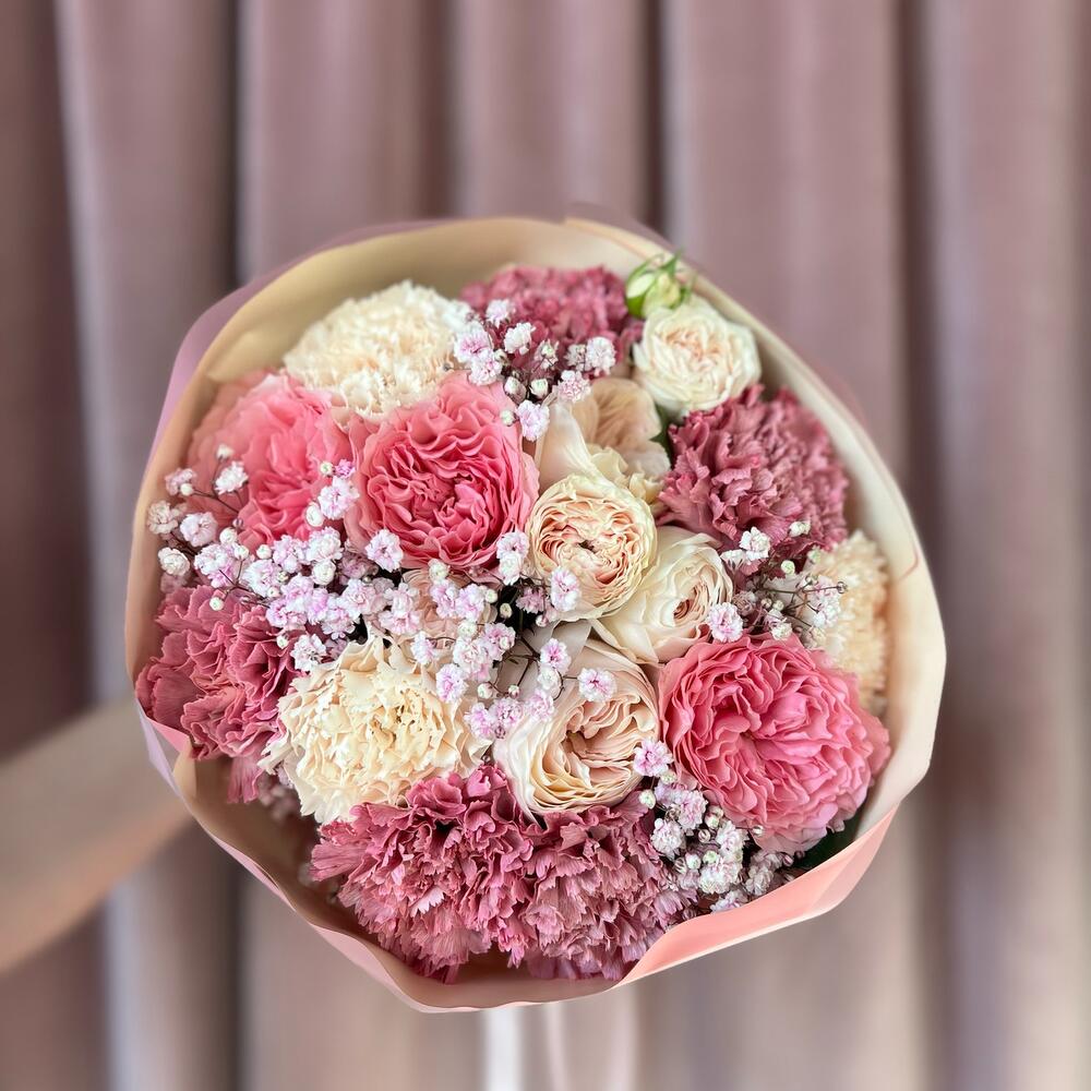 Диантус – 8 шт.Кустовая пионовидная роза – 1 шт.Пионовидная роза – 6 шт.Гипсофила – 2 шт.декоративная упаковка – 1 шт.Атласная лента – 1 шт.