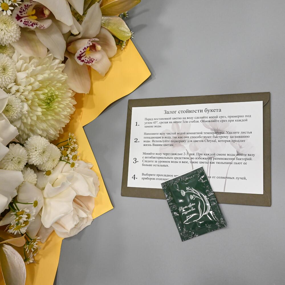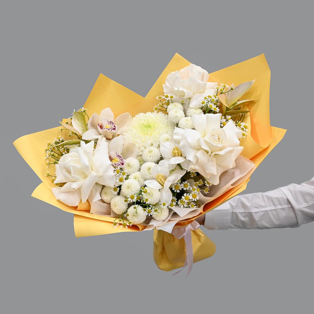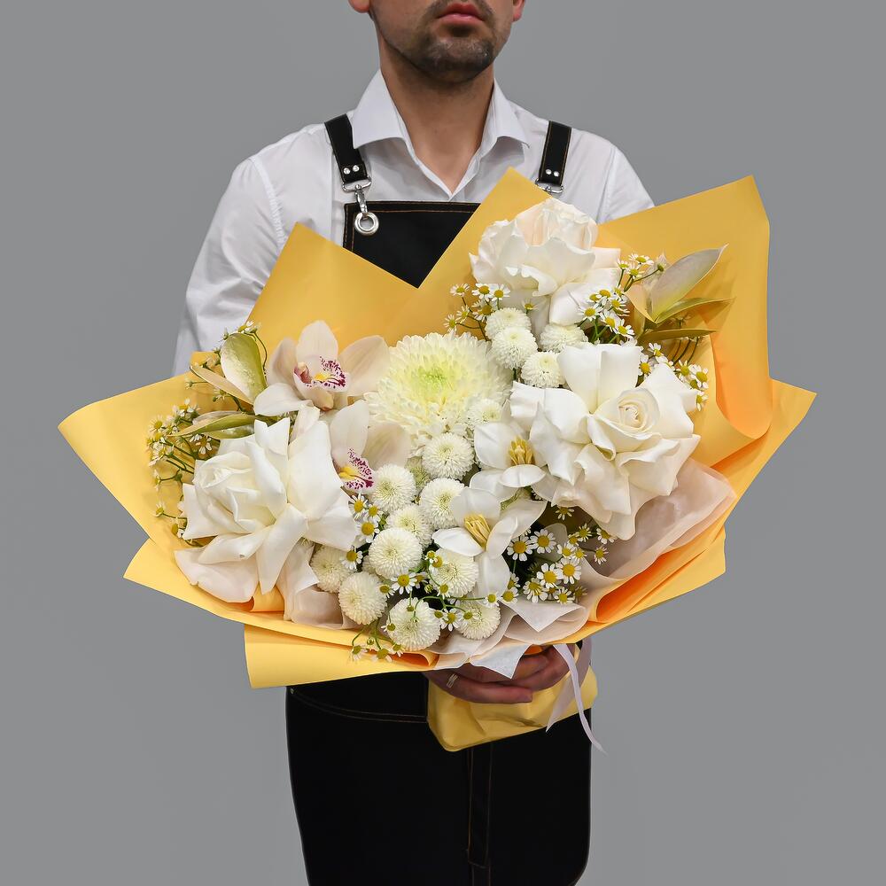 Орхидея Цимбидиум – 2 шт.Рускус – 3 шт.Тюльпан – 2 шт.Хризантема кустовая – 3 шт.Ромашка – 3 шт.Хризантема – 1 шт.Упаковка дизайнерская – 1 шт.Французская роза – 3 шт.