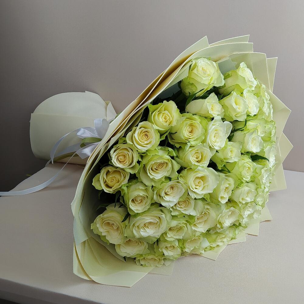 Лента атласная – 2 шт.Роза Кенийская – 55 шт.Упаковка дизайнерская – 1 шт.