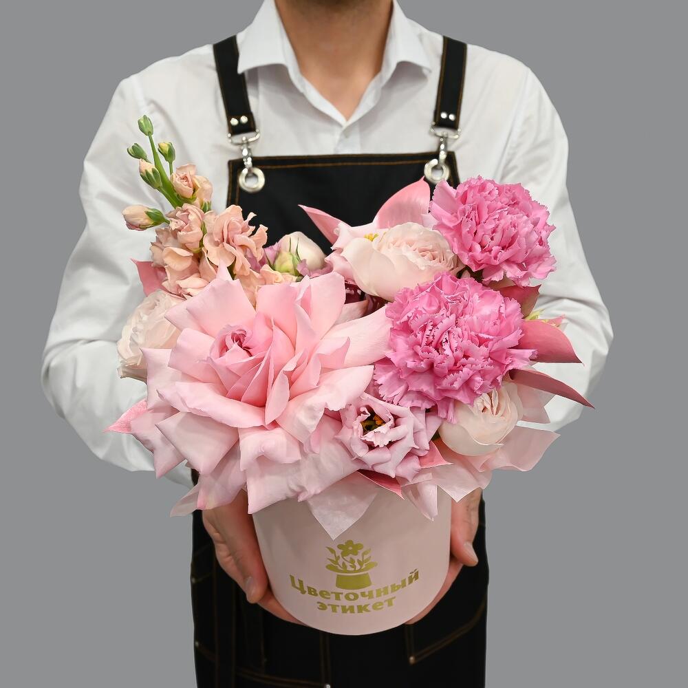 Маттиола – 1 шт.Рускус – 3 шт.Гвоздика – 2 шт.Эустома – 1 шт.Шляпная коробка – 1 шт.Французская роза – 1 шт.Пионовидная кустовая роза – 1 шт.Оазис флористический – 1 шт.