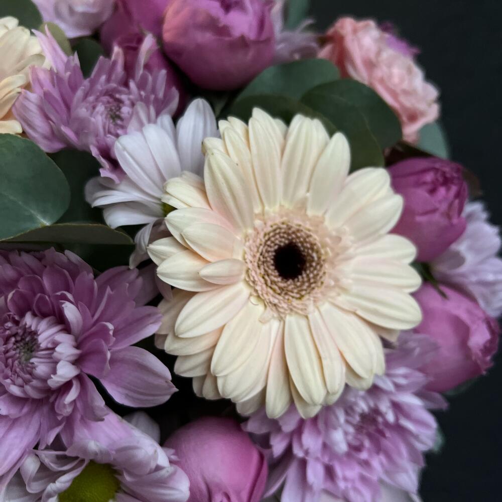 Кустовая роза – 5 шт.Гербера – 5 шт.Кустовая хризантема – 4 шт.Эвкалипт – 2 шт.Коробка шляпная – 1 шт.Флористическая губка – 1 шт.