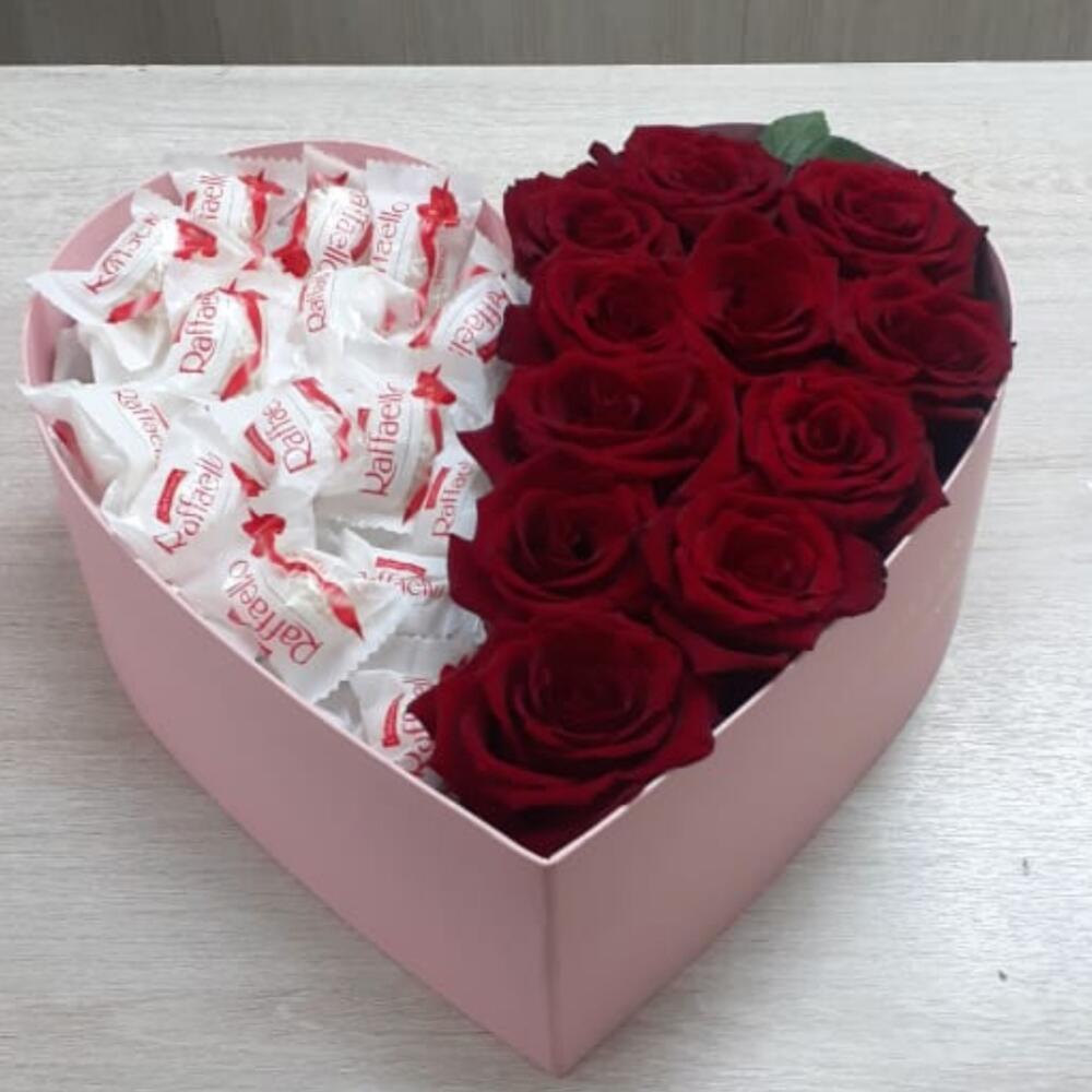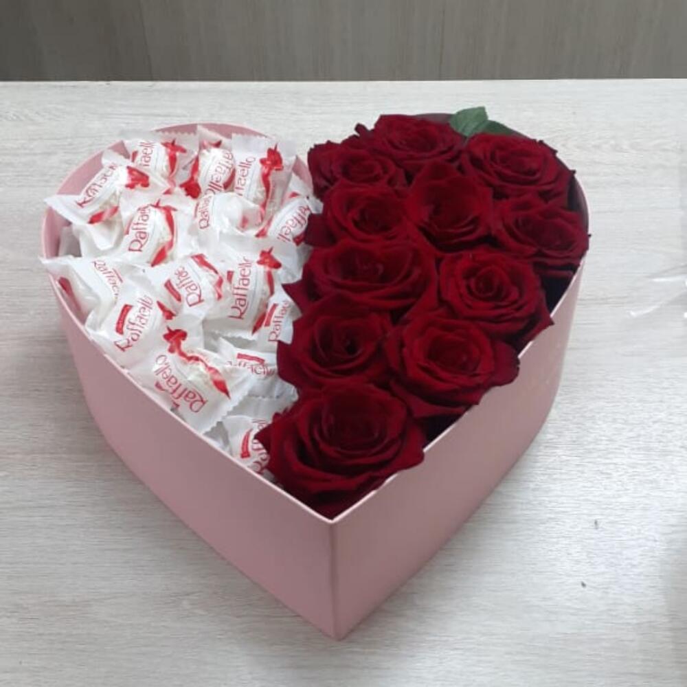 “Сладкое сердце ” – цветочная композиция с сладостями в коробке “Сердце”