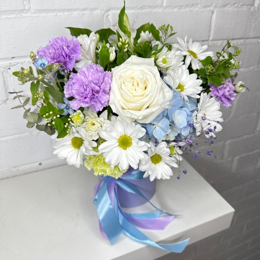 Хризантема кустовая – 3 шт.Диантус – 3 шт.Роза Эквадор – 1 шт.Гортензия – 1 шт.Фисташка – 3 шт.Оазис флористический – 1 шт.Шляпная коробка с лентами – 1 шт.