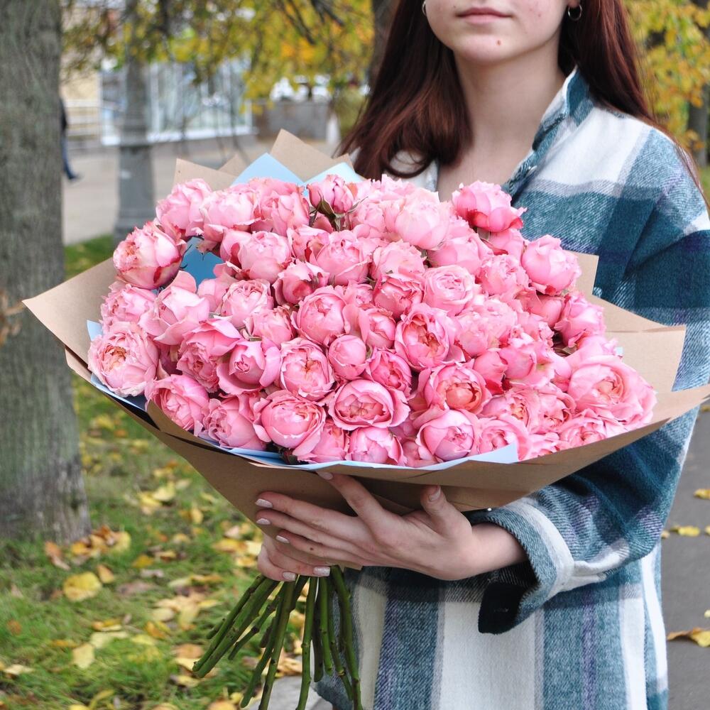 Роза кустовая пионовидная – 21 шт.Пленка матовая – 2 шт.Крафт – 2 шт.Лента атласная – 1 шт.
