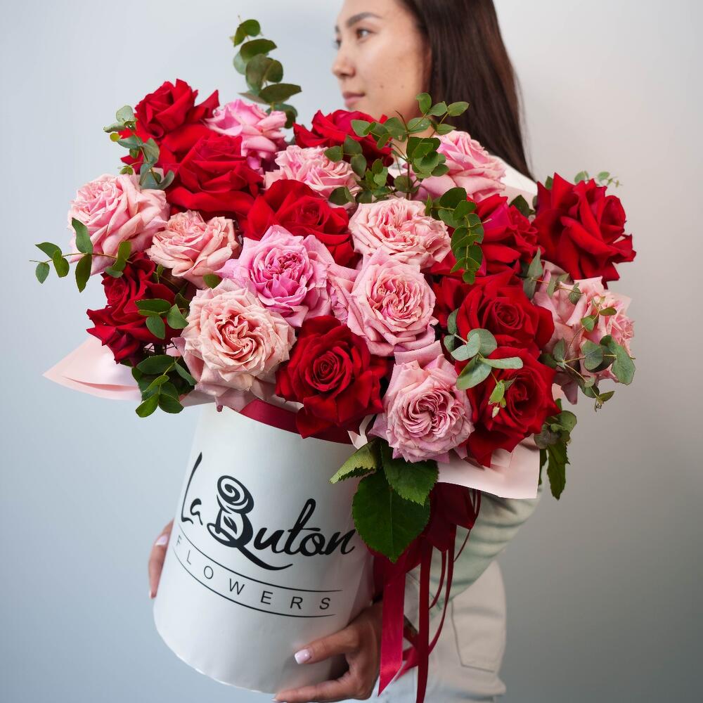 Эвкалипт – 3 шт. Роза – 21 шт. Коробка – 1 шт. Оазис флористический – 2 шт.