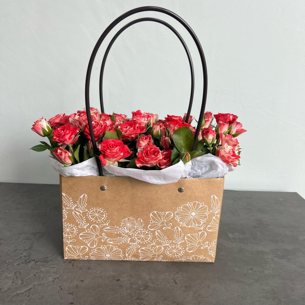 Кустовая роза – 3 шт.Оазис – 1 шт.Коробка – 1 шт.Тишью белое – 1 шт.